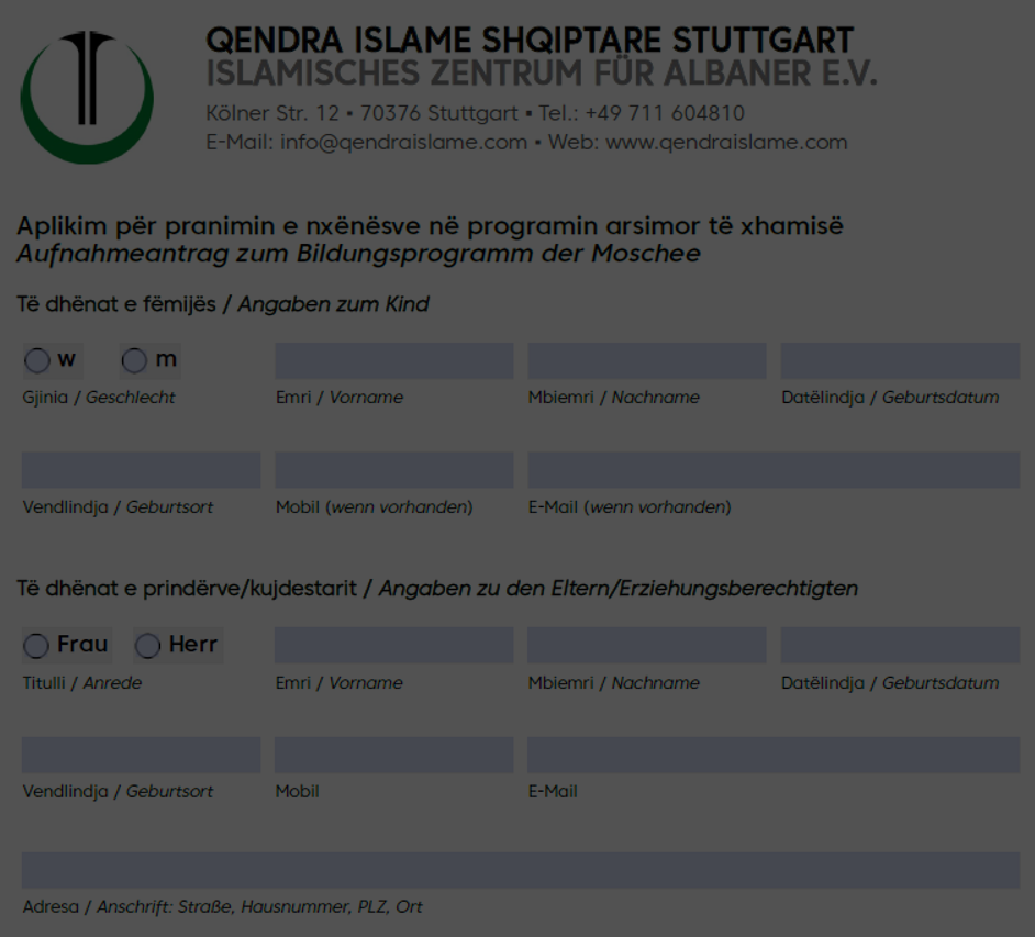 Formullari për mësimin plotësues në gjuhën shqipe: Aufnahmeantrag_msimi-plotesues-shqip Formullari për mësim-besim për të rritur: Aufnahmeantrag-Erwachsene.pdf Formullari për mësim-besim për fëmijë: Aufnahmeantrag-Kinder.pdf Formullari për antarësim: Mitgliedsantrag.pdf