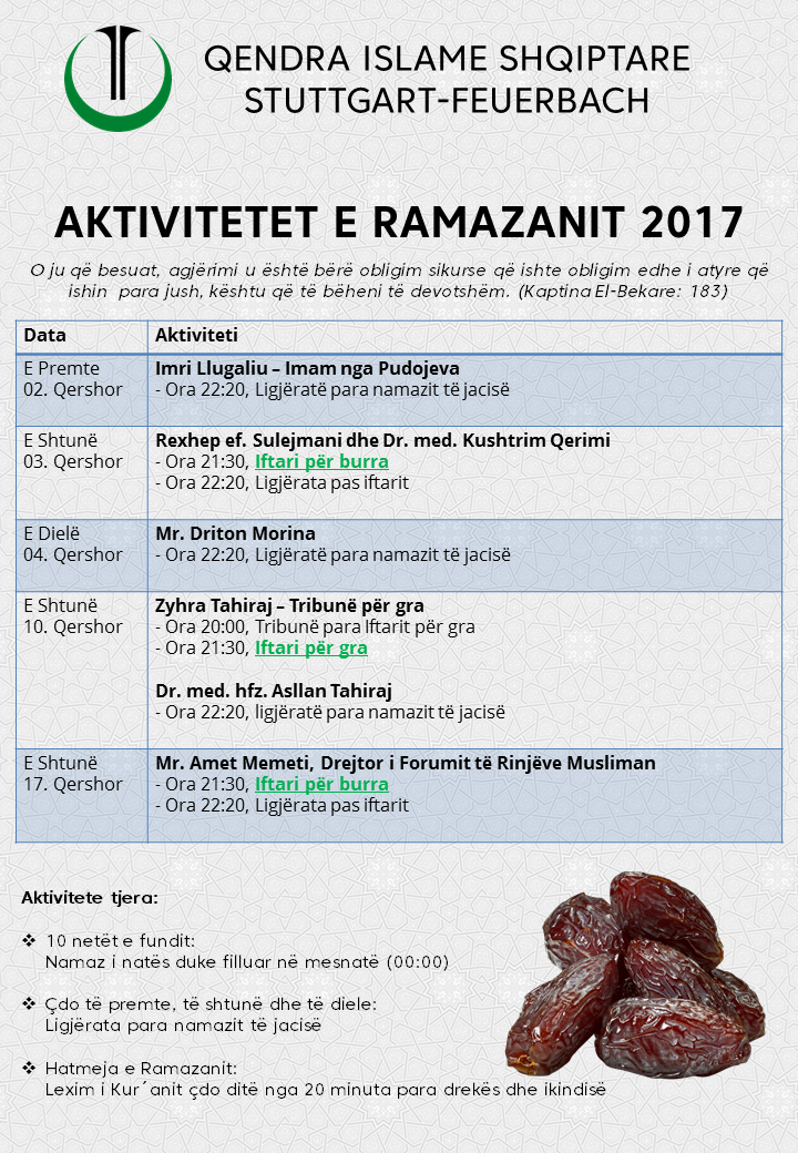 Disa aktivitete nga Ramazani 2017 Admin30.05.201730.05.2017 Njoftime ← Imsakia e Ramazanit për Stuttgart U dha leja për Xhaminë e re në Stuttgart →