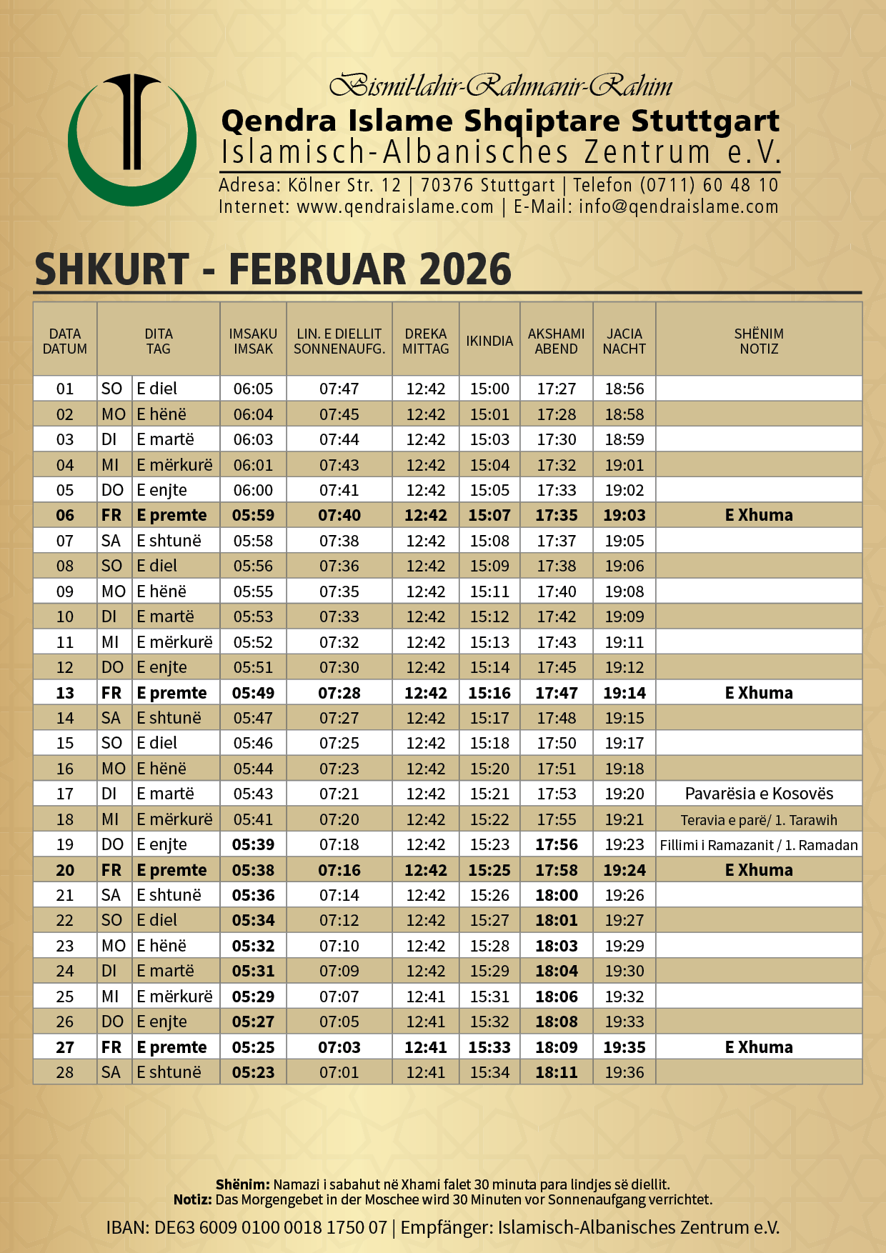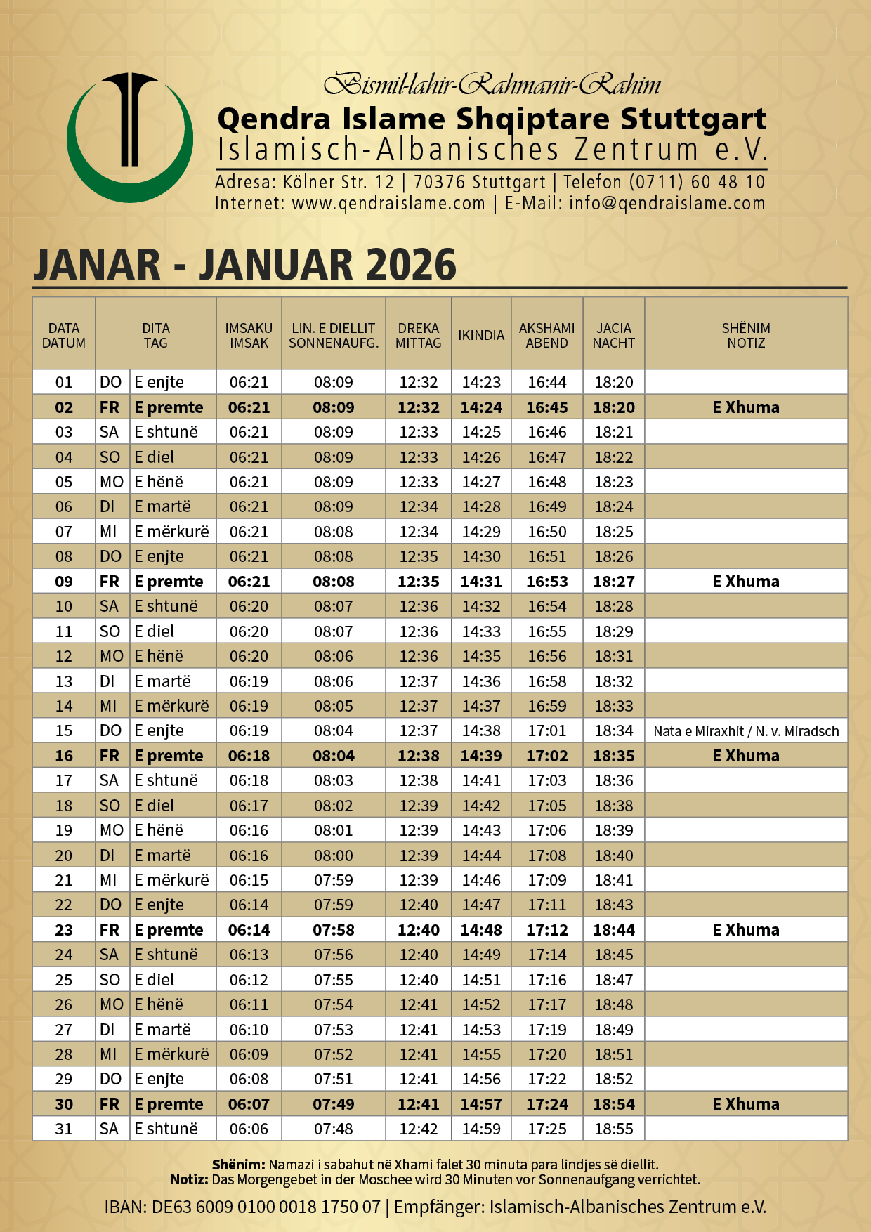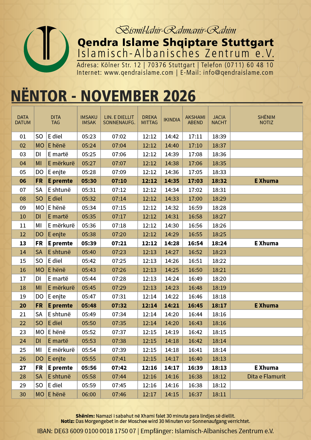 Takvimi 2026 Janar / Januar Shkurt / Februar Mars / März Prill / April Maj / Mai Qershor / Juni Korrik / Juli Gusht / August Shtator / September Tetor / Oktober Nëntor / November Dhjetor / Dezember