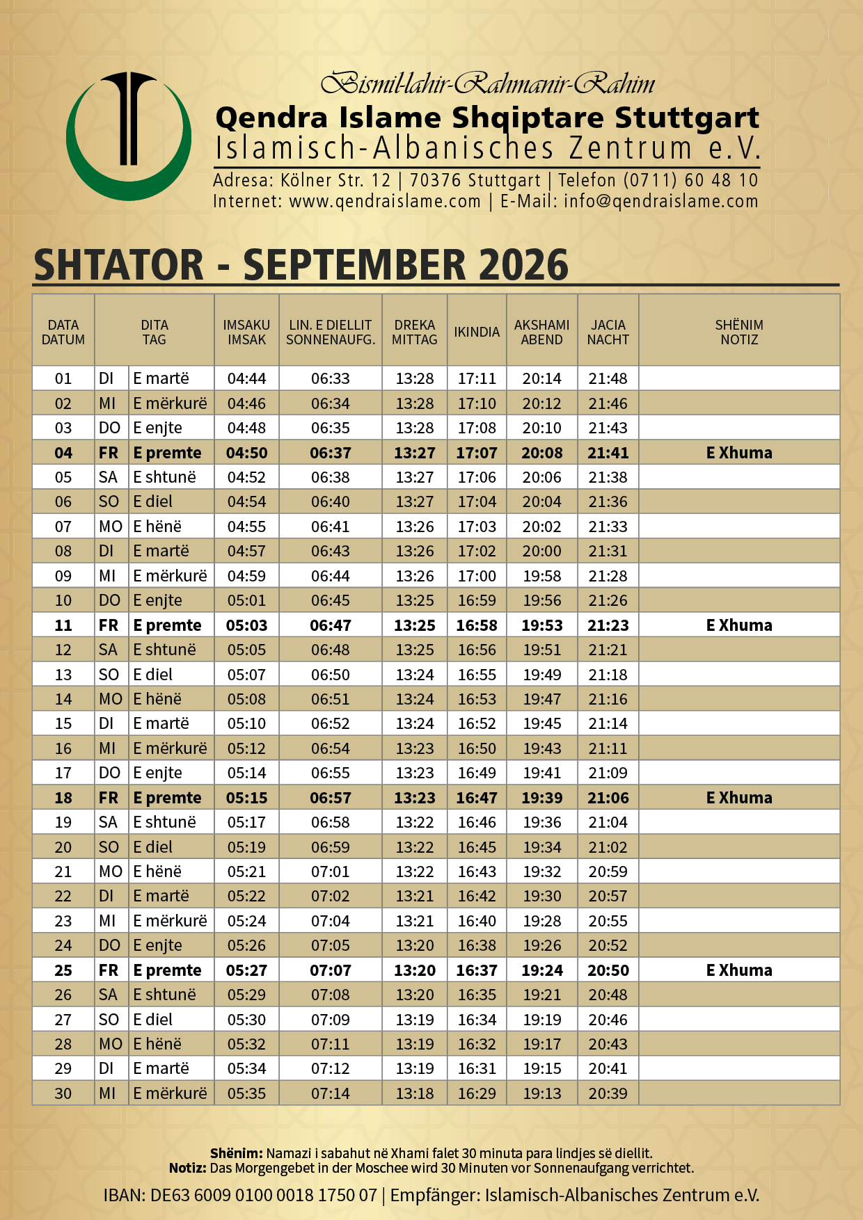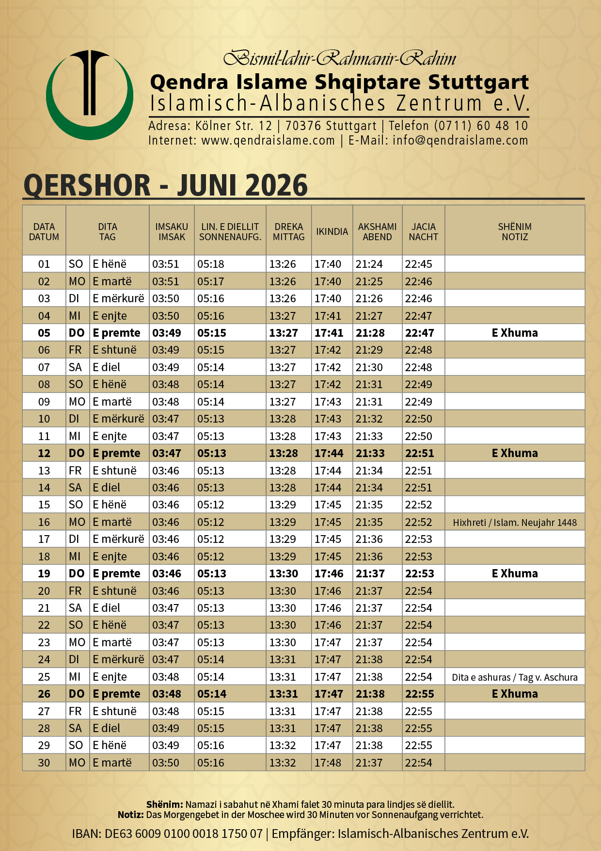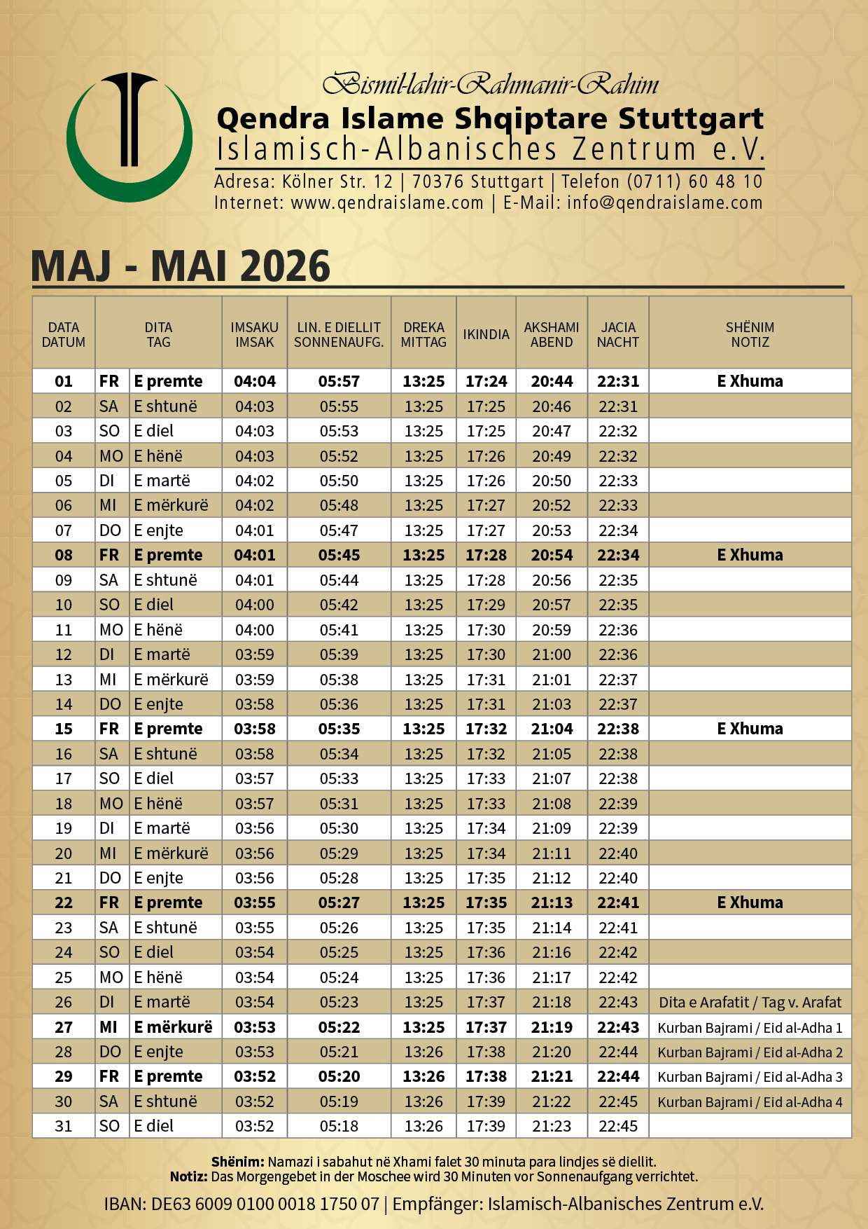 Takvimi 2026 Janar / Januar Shkurt / Februar Mars / März Prill / April Maj / Mai Qershor / Juni Korrik / Juli Gusht / August Shtator / September Tetor / Oktober Nëntor / November Dhjetor / Dezember